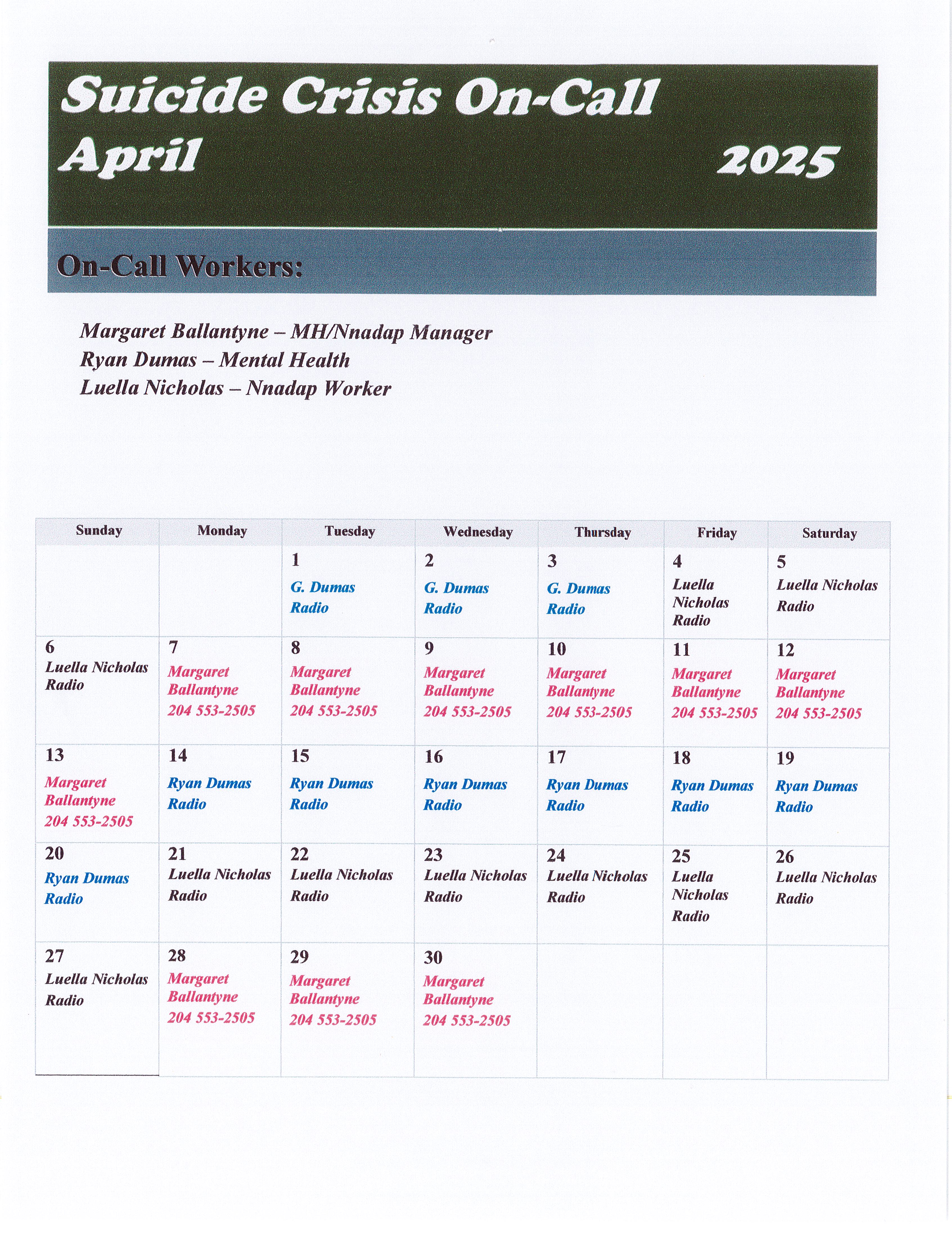 ON-CALL SCHEDULE FOR APRIL 2025